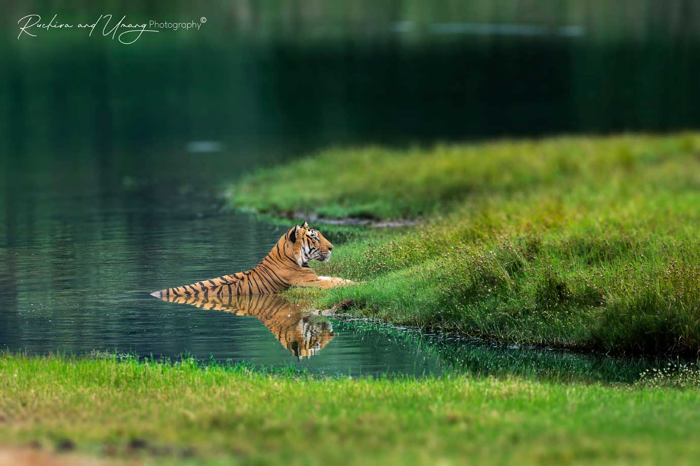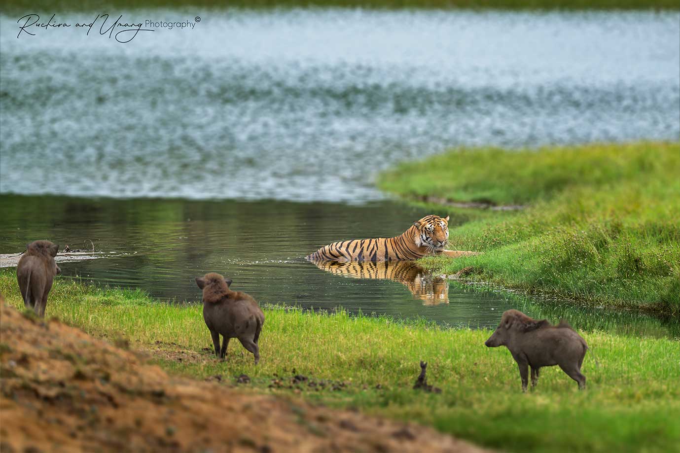 Humour & Awe A tiger sprawled lazily in the waterbody while three wild boars grazed, blissfully unaware. A yawn — nothing more — and the forest turned upside down. The boars fled in terror, leaving us laughing at the quiet power of presence.